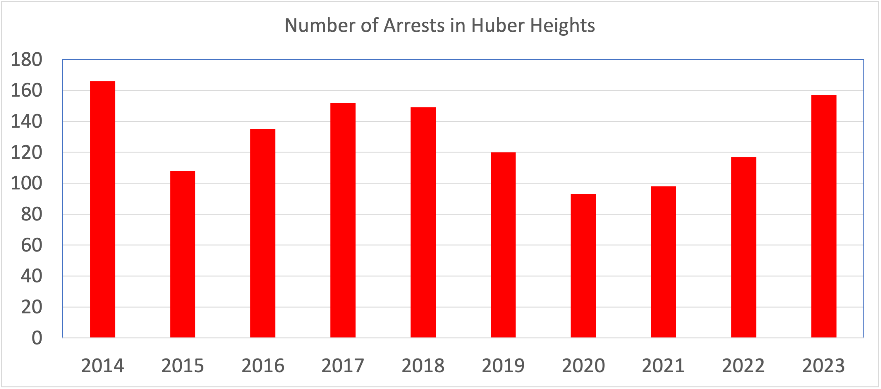 The number of arrests for domestic violence has been between 93 and 161 from 2014 to 2023. It is estimated that there are at least twice this number of domestic violence incidents. The pie charts show the percentages of the arrestee's versus the complainant's sex.